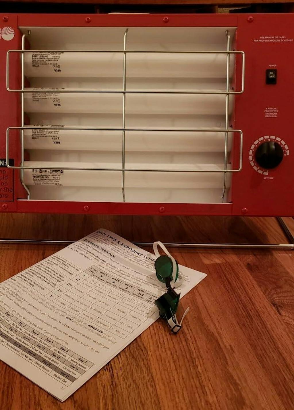 Jetzt, zwei Monate später, habe ich mich sicher auf 15 Minuten täglich gesteigert. Ich halte immer noch etwas mehr Abstand zur Lampe, um auf Nummer sicher zu gehen, was das Hautkrebsrisiko angeht. Zu Hause habe ich eigentlich gar keinen idealen Platz für so etwas, aber ich bekomme es trotzdem hin. Ich nutze sie im Badezimmer, wo ich gerade genug Platz habe, sie auf den Boden zu stellen. Dass man den Lampenkopf neigen kann, macht die Anwendung einfach – ich kann sie nach oben kippen, um meinen ganzen Körper zu bestrahlen. Ich bräune nackt und rotiere alle paar Minuten, sodass ich keinerlei Bräunungslinien habe. Da ich die Lampe am Boden verwenden muss, ist das Ergebnis nicht ganz so intensiv wie gewünscht, aber das wird sich ändern, sobald ich umziehe und mehr Platz habe. Alles in allem funktioniert sie unter meinen Bedingungen wirklich gut.